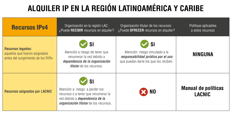 Respecto a aquellos recursos asignados por nuestro Registro, se rigen por el Manual de Políticas de LACNIC. Con lo anterior, aquellas organizaciones que son titulares de recursos asignados por LACNIC no los pueden ofrecer en alquiler pues esto no está considerado como una justificación de uso de los recursos que LACNIC les asignó.