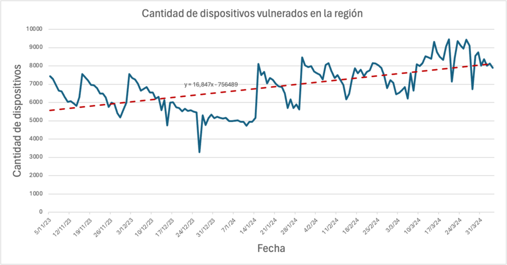 Desde el LACNIC CSIRT hemos observado un crecimiento en la cantidad de dispositivos de la región afectados por esta vulnerabilidad desde que fue publicada.
