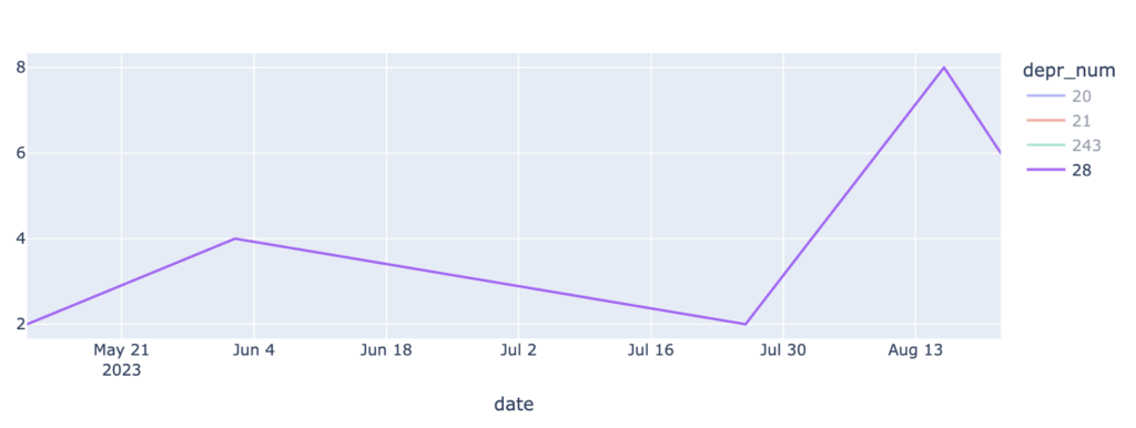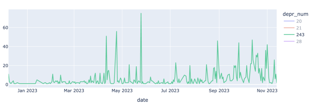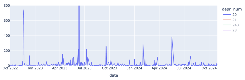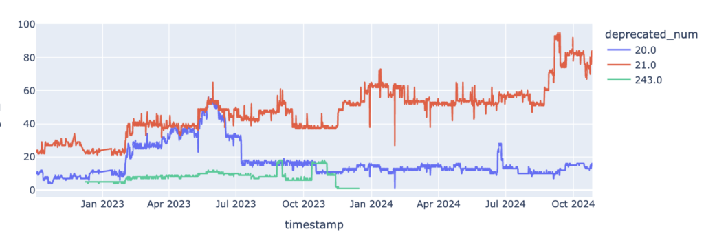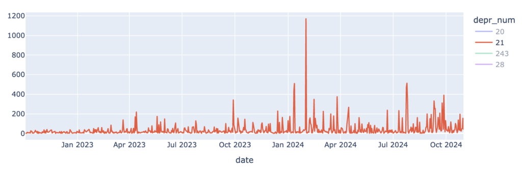 Si se considera la cantidad de anuncios para cada ASN por separado, se observó que 3 ASN comienzan a anunciar con el atributo 21 a partir del 21 de agosto de agosto del 2024. Y un cuarto ASN tiene un fuerte aumento de anuncios por esas fechas aportando al incremento.