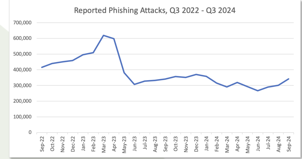 De acuerdo con último reporte compartido por APWG  observamos que el número de phishings distintos reportados se han mantenido entre 290.000 y 370.000 por mes, desde el año 2023 como lo muestra la siguiente gráfica.