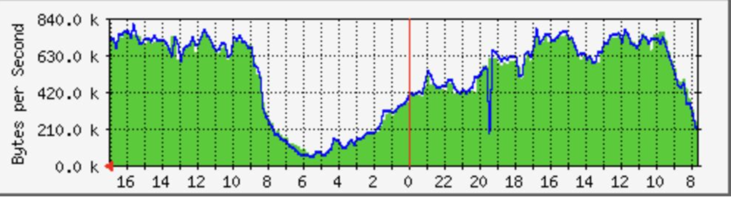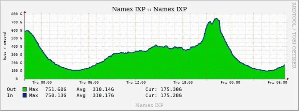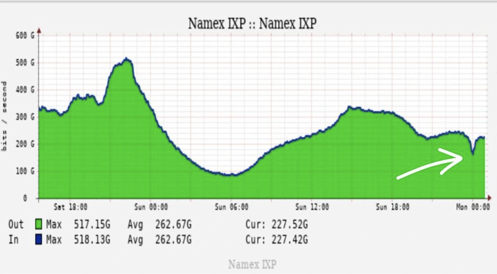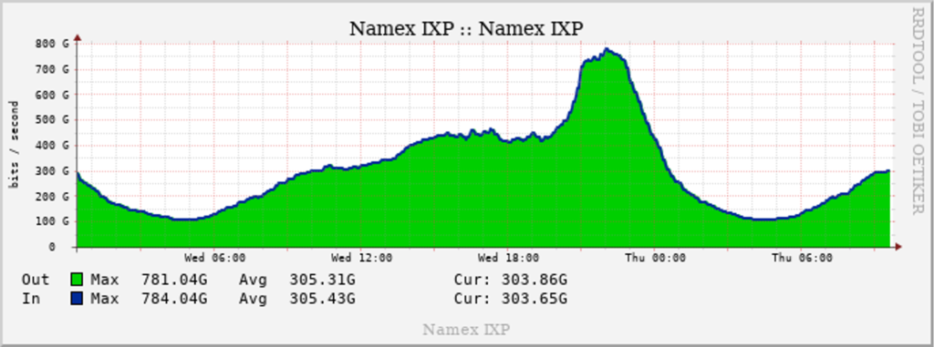 Aclaración: La imagen anterior muestra la típica gráfica de tráfico de Internet de un IXP. El eje vertical representa la unidad de medida de la velocidad de transmisión de datos (Gb/s: gigabits por segundo), mientras que el eje horizontal muestra la línea temporal (las últimas 24 horas). Los datos se recopilan en intervalos regulares, usualmente cada cinco minutos. Además de esta gráfica diaria, se exhiben también las gráficas semanales, mensuales y anuales. El término ‘’picos de tráfico” refieren al valor más alto en un período específico. Por ejemplo, en la imagen anterior el pico de tráfico de Internet es de 784,04 Gb/s.