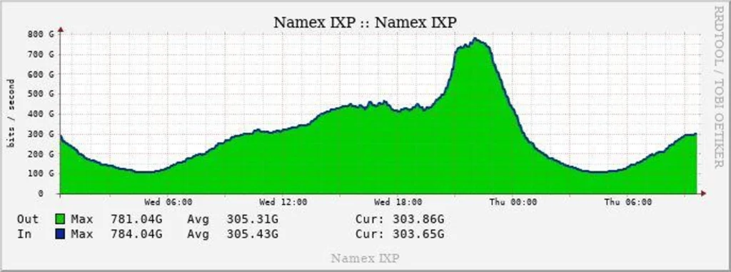 Aunque Namex siempre ha contado cada bit que ha pasado por su infraestructura de interconexión desde su creación, el verdadero monitoreo comenzó en 2011 con la llegada de los primeros proveedores de contenido y las primeras redes de distribución de contenido (CDN) al IXP en Roma. Esto se debe a que a partir de 2011 comenzó un incremento significativo en el tráfico de Internet en Roma y, en consecuencia, monitorearlo se volvió crucial para analizar su impacto.
