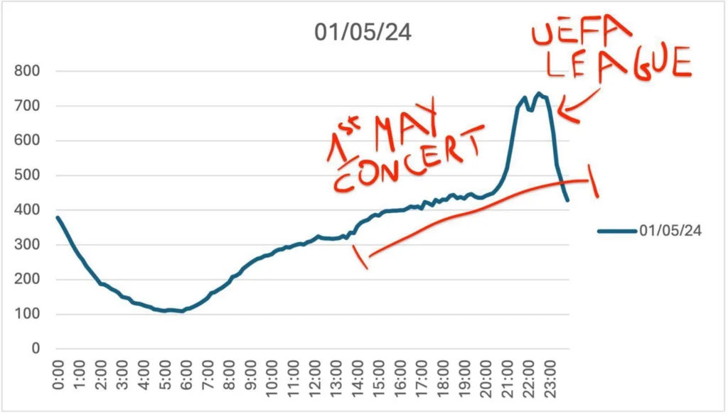 Tal como se explica en este artículo, ha habido diferentes eventos interesantes y visibles en las gráficas de tráfico de los IXP a lo largo de los años, que a menudo reflejan nuevos comportamientos sociales. Algunos de los eventos observados fueron el Concierto del Primero de Mayo y el Festival de la Canción de San Remo [1] hasta los Juegos Olímpicos de París 2024 [2], así como la caída en el tráfico debido a las celebraciones de Año Nuevo y las transmisiones de los partidos de Italia en RaiPlay.