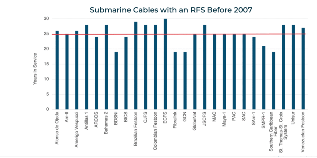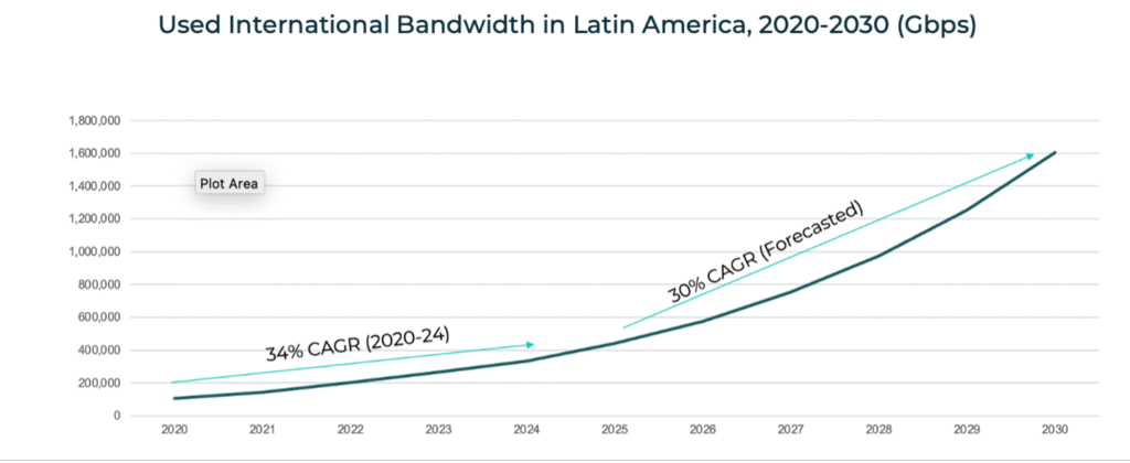 International bandwidth demand in Latin America continues to rise, although growth rates are decelerating steadily. This broadly mirrors international bandwidth demand trends seen at the global level, where annual growth has fallen below 30% in 2024. More localized content in regional hubs, like São Paulo, may have reduced the need for international capacity and thus affected demand growth. We also may be entering a new phase of network buildout in LATAM and, typically, as markets become more mature, we expect growth rates to slow down (as we have seen in Europe, for example). Even as these growth rates have dipped, aggregate demand in Latin America and the Caribbean more than tripled between 2020 and 2024.
