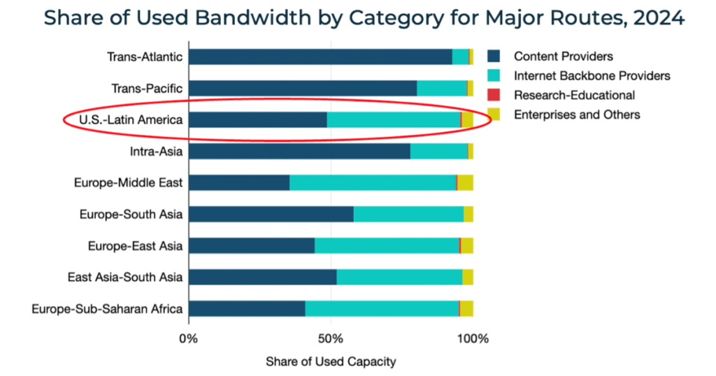 In 2024, content providers finally passed internet backbone providers to become the main source of used bandwidth on the U.S.-Latin America route. Content providers’ demand achieved an impressive 50% compound annual growth rate (CAGR) between 2020-24, reaching over 90 Tbps in 2024. For comparison, internet backbone providers had just a 21% CAGR during this time. Despite all this massive growth from content providers, it is important not to overlook the key role ISPs continue to play in LATAM. As shown in the graphic below, internet backbone providers continue to have a large share of the used bandwidth on the U.S.-Latin America route.