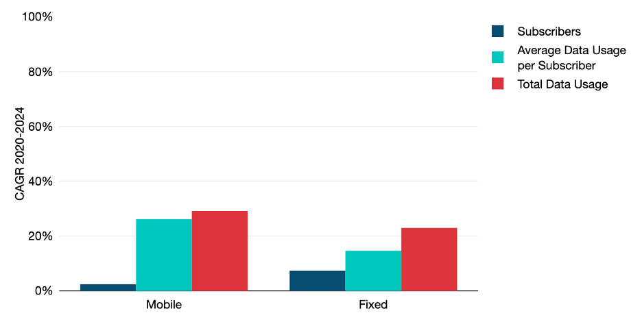 What is really driving bandwidth demand growth in LATAM? In the graph below you can see the growth in subscribers, average data usage per subscriber and total data usage for both fixed and mobile devices. The region continues to gain new subscribers at very modest rates for both fixed and mobile devices. Most of the growth is coming from a boost in the average data usage per subscriber. Mobile devices reached a CAGR of over 25% between 2020 and 2024 for average data usage per subscriber, while fixed devices achieved around a 15% CAGR during this time. As we adopt new technologies and increasingly bandwidth-intensive applications, we can expect total data usage to continue to rise even as the growth of new subscribers dries out.