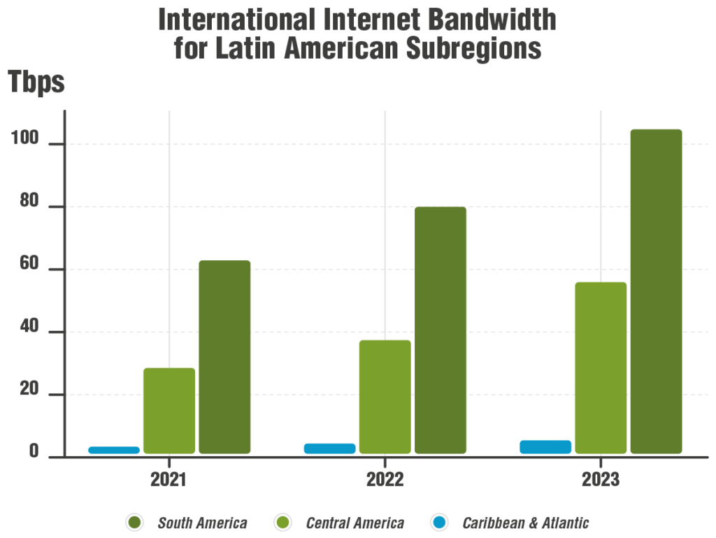 In Latin America, international bandwidth reached 157 Tbps in 2023, growing at a rate of 34%, which exceeded the growth rates observed in previous years.