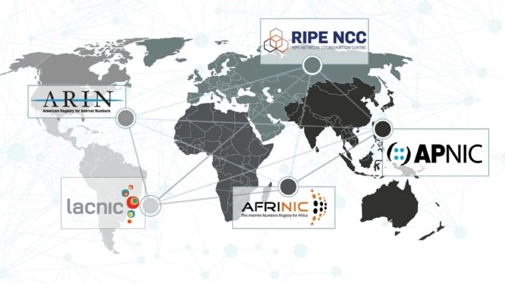 The management of these resources is coordinated in a decentralized manner by the five Regional Internet Registries (RIRs): ARIN in North America, RIPE NCC in Europe and the Middle East, APNIC in Asia-Pacific, AFRINIC in Africa, and LACNIC in Latin America and the Caribbean. This regional distribution follows the segmentation defined and recognized by the IANA.