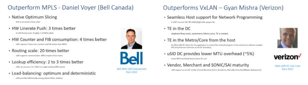 Bell Canada, for instance, migrated from SR-MPLS to SRv6 uSID in their Metro network. They realized significant economic benefits by eliminating MPLS, simplifying their network by avoiding the complexity of RFC 3107, and increasing routing scale through IP summarization. During MPLS World Congress Dan Voyer(Fellow at Bell) introduced their deployment (recording here), highlighting how uSID outperforms MPLS for Metro networks. He analyzed various angles, such as hardware performance with larger linerate dataplane push capabilities and reduced FIB/counter consumption, improved routing scale with more nodes per domain, and efficient load-balancing due to uSID’s hardware-friendly entropy solving the problematic of MPLS.