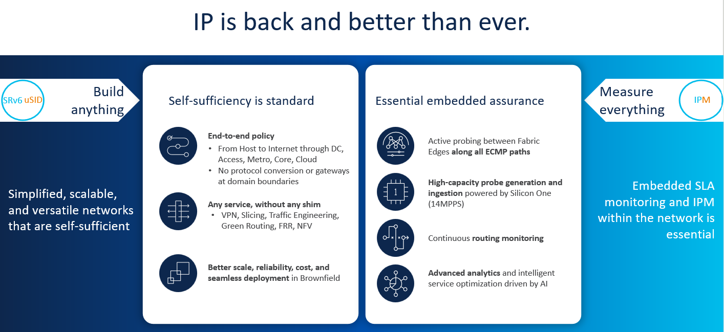 Almost 10 years ago a group of passionate network engineers embarked on a journey to simplify networks by bringing back IP, in a self-sufficient manner, and removing all the unnecessary shim-layers that the industry has heavily relied on. This is what led to the inception of SRv6 uSID, with the intention to make IPv6 self-sufficient. It is based on three pillars:
