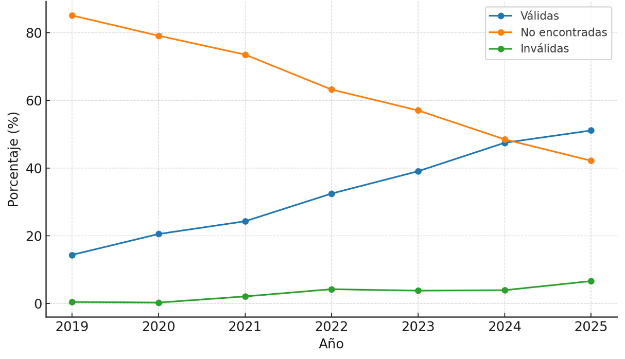 Valid routes: increased from 9.89% (2019) to 46.10% (2025), a growth of more than 500%.