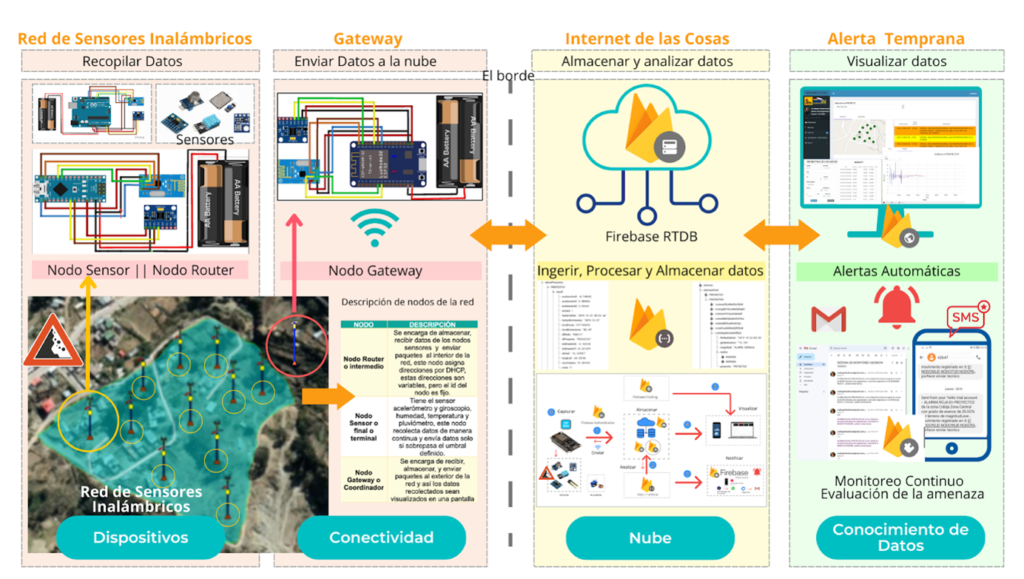 The expert conducted an analysis of risk areas in La Paz, including the causes and factors that generate landslides. Her work also incorporated a documentary and experimental research on landslides, taking as a reference her undergraduate project. In order to identify monitoring variables, the study area, and the current procedure, she used the Top-Down Approach to develop the network design, implement the system, and carry out their respective tests.