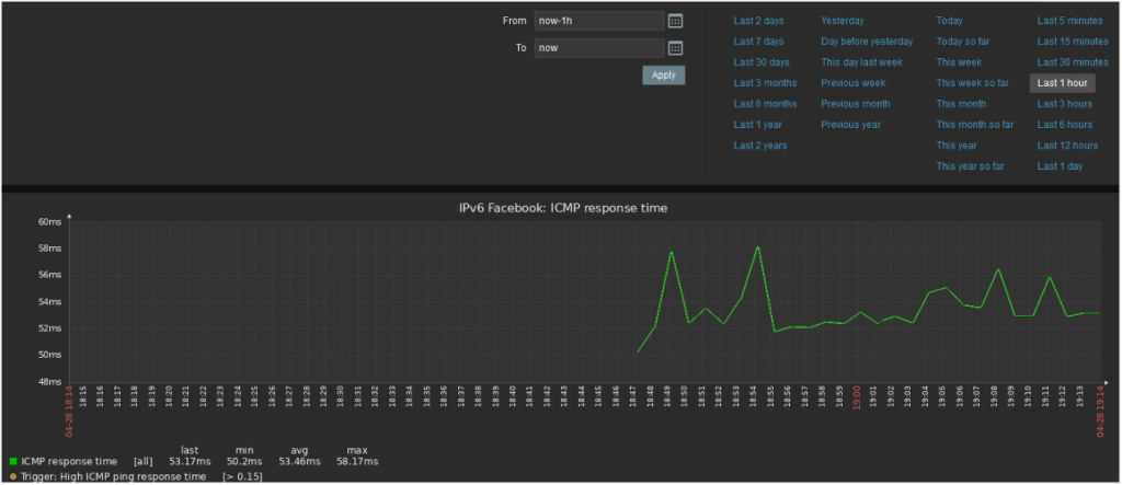 Además de obtener los datos de forma detalla, Zabbix también tiene la capacidad de crear gráficos. Esto nos permite tener una visibilidad y comprensión del comportamiento de los recursos que monitoreamos. En entornos IPv6 only, estos gráficos son de gran importancia ya que nos permiten ver la evolución de un recurso a través del histórico, lo cual es de gran utilidad para detectar tendencias y tomar decisiones informadas.