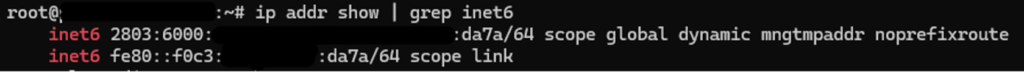 Seguido a esto podemos verificar que ya nuestro servidor cuente con una dirección IPv6 asignada correctamente. Esto lo podemos lograr con el siguiente comando.