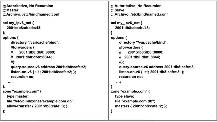 En la configuración del archivo ‘/etc/bind/named.conf’ del Servidor DNS Secundario, le especificamos que es slave y el direccionamiento IPv6 de los servidores master.
