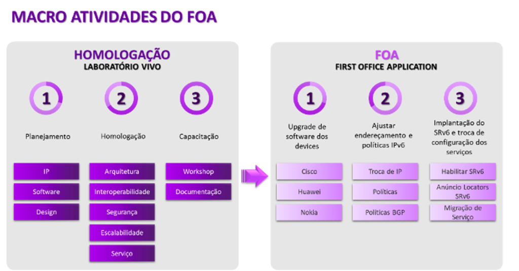 Sin embargo, este trabajo de cambiar de tecnología dos (2) veces en un proveedor del tamaño de Telefônica VIVO es demasiado traumático y costoso, por lo que decidimos saltarnos una fase y pasar directamente a SRv6. En ese momento existían muchas dudas sobre la madurez de la tecnología para su implementación masiva en la red. Sin embargo, la evolución de la red hacia su punto de destino sería una solución mucho más ventajosa, dado que se evitarían la doble transición, las inversiones no capitalizadas asociadas a una potencial subutilización de las inversiones en SR-MPLS si la migración a SRv6 se produce rápidamente, la reconfiguración de la red y la duplicación de los esfuerzos, la prolongación del proceso y, más que nunca, la obsolescencia técnica asociada al riesgo de que la tecnología SR-MPLS se vuelva obsoleta más rápidamente con el avance de SRv6.