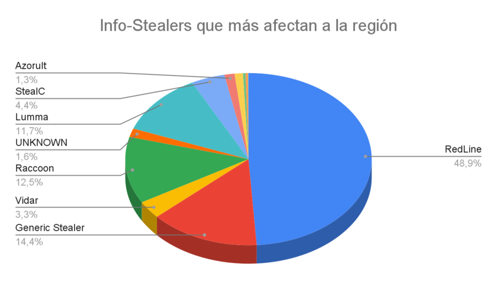 Se observa que los tres Info-Stealers que más afectan a nuestra región son RedLine, Raccoon y Lumma. Si bien estos malware comparten el objetivo común de robar credenciales e información, presentan diferencias en cuanto a sus métodos de infección, tipos de datos que sustraen y capacidad de evasión.