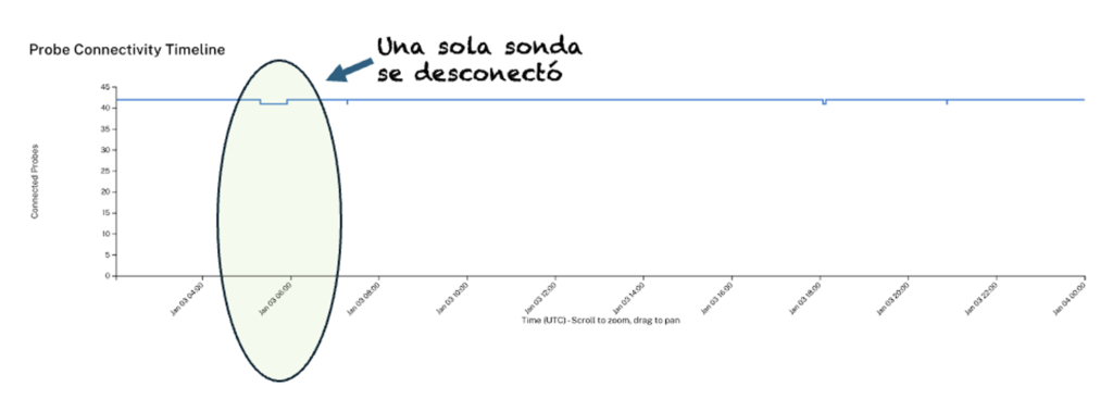 El 3 de enero había 42 sondas conectadas en Venezuela; solo 1 se vio afectada por el ataque desconectàndose por un breve periodo de tiempo, como se puede apreciar en la figura a continuación: