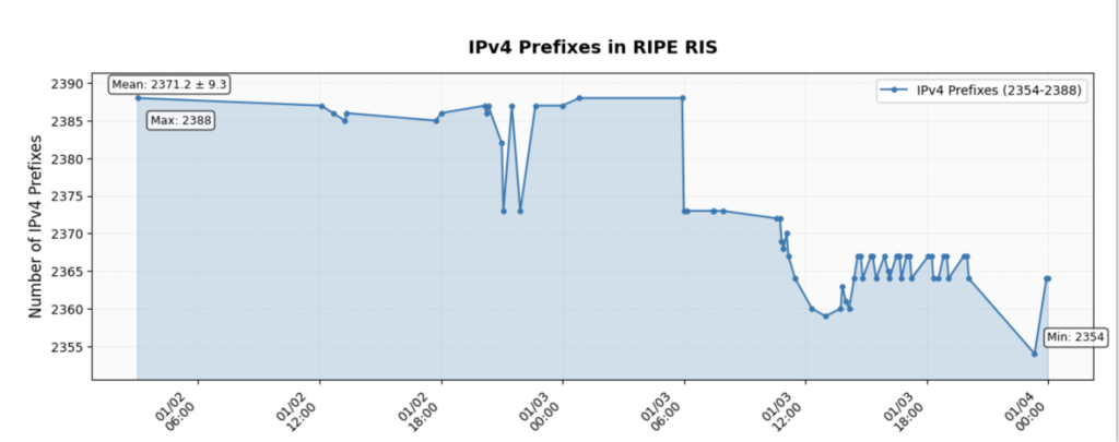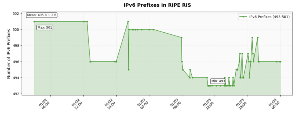 Se puede apreciar poca afectación de los recursos vistos en las tablas de enrutamiento global, resumido en una bajada en todos los recursos. El punto más bajo de visibilidad se alcanzó el 3 de enero a las 3:20 pm donde, entre otros, se vieron solo 2357 prefijos venezolanos IPv4 en la DFZ.