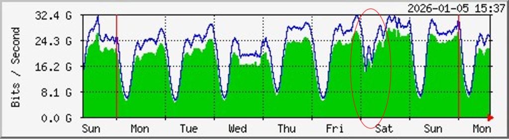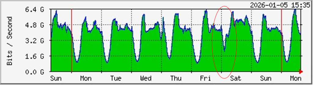 En IXP Caracas, en cambio, el patrón observado es menos tráfico durante la ventana del evento, asociado a un factor específico: falla de uno de los enlaces internacionales que afectó la entrega de servicios “despachados” desde CDNs.