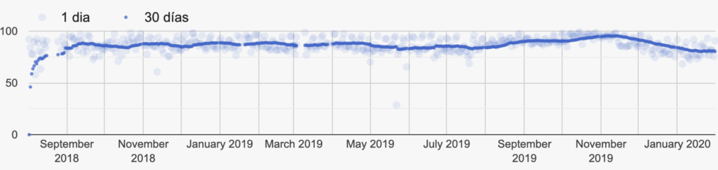 Para ese período de tiempo la media es de 86%, donde hay intervalos mayores a 95% para la ventana de 30 días.