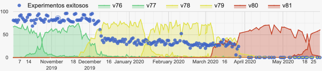 El market share que percibimos de Google Chrome es alto: más de un 70% de los experimentos que corremos se estan ejecutando dentro de Chrome. Un cambio dentro de las políticas de Chrome puede tener un gran impacto en el experimento. Y de hecho ese cambio de políticas llegó en Chrome versión 78. En el gráfico siguiente comparamos el release de sucesivas versiones de Chrome con los resultados exitosos del experimento. Nótese que el market share, o adopción de una versión de Chrome comienza a bajar al mismo tiempo que la sigueinte versión comienza a subir, naturalmente ya que un navegador se actualiza y comienza a reportarse con su nueva versión. Al momento del release de Chrome v78 la cantidad de experimentos exitosos baja a la mitad, y al momento del release de v80 pasa a practicamente 0.Experimentos exitososv76v77v78v79v80v81November2019December2019January 2020February 2020March 2020April 2020May 20207141816161825050100