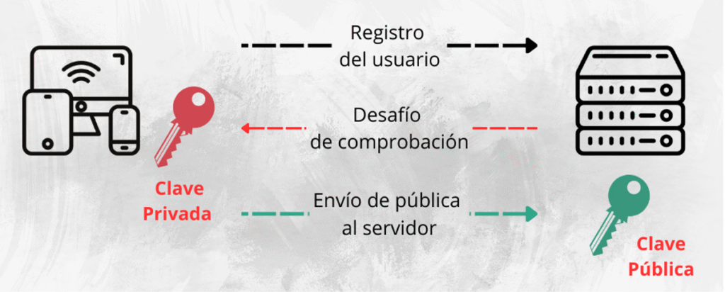 Las Passkeys se basan en criptografía de clave pública y privada. Al crear una passkey en un sitio web, se generan dos claves. La clave privada se almacena cifrada en el dispositivo del usuario (ordenador, móvil, etc.), mientras que la clave pública se guarda en el servidor web.