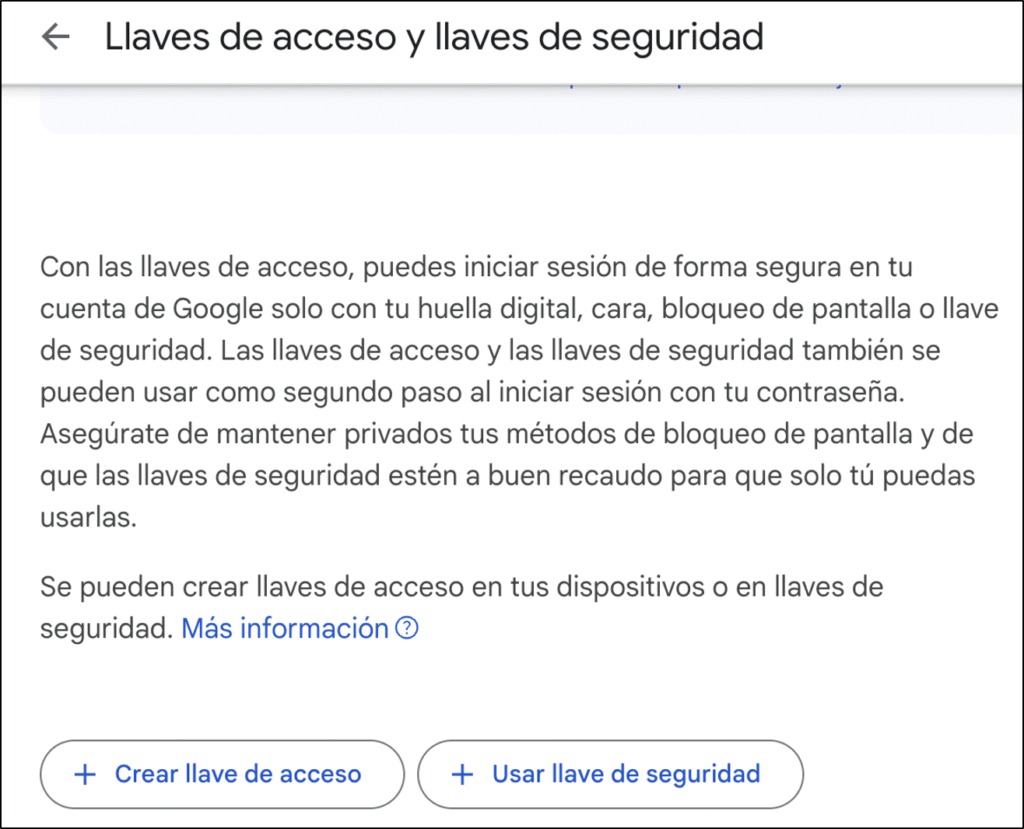 Puede aparecer como “Passkey” o “Llave de acceso”, según la traducción.