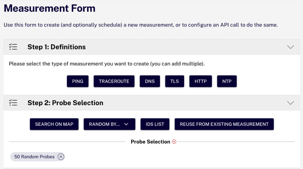 O RIPE Atlas é uma rede de sondas distribuídas no mundo todo que medem continuamente a acessibilidade e o desempenho da Internet, fornecendo informações técnicas sobre seu funcionamento. Essa rede de sensores permite fazer medições personalizadas em destinos específicos. Os diferentes tipos de medições que podem ser feitas são: