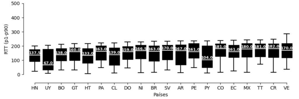 As medições mostram que as rotas de interconexão variam dependendo do par de países de origem–destino. Em termos gerais, observou-se que a latência dos saltos que saem da região do LACNIC é maior do que a dos saltos que permanecem na região.