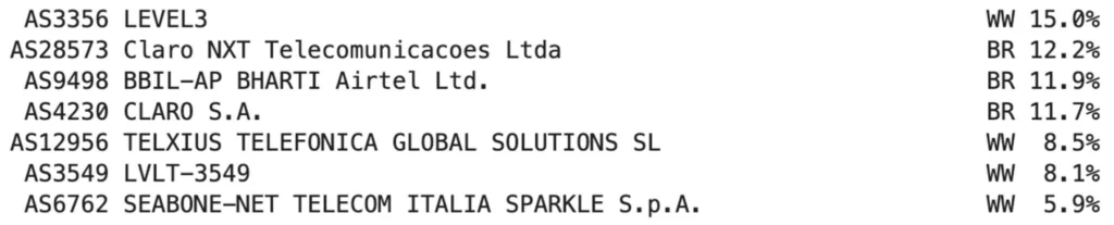 Assim como no primeiro relatório sobre rotas dentro do mesmo país, analisamos os ASN mais visualizados por sub-região, ou seja, com origem em uma sub-região e destino nas 3 sub-regiões. Por exemplo, a imagem a seguir mostra os ASN mais vistos em caminhos com origem e destino na América do Sul: