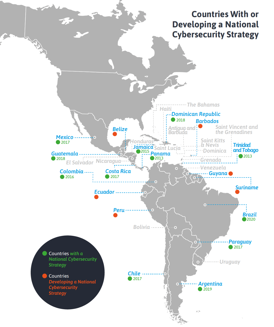 A fim de avaliar as capacidades cibernéticas da nossa região, focamos em três perspectivas reveladoras na revisão sobre preparação em cibersegurança na América Latina e no Caribe. Entre 33 economias da região, encontramos que 18 já possuíam planos estratégicos de cibersegurança nacionais ou estavam desenvolvendo-os ativamente. Estes planos servem como documentos integrais e colaborativos que descrevem áreas estratégias para melhorar a resiliência no ciberespaço, responder às ameaças cibernéticas, promover a consciência cibernética e garantir medidas legais para oferecer justiça às vítimas do crime cibernético. É fundamental que os planos estratégicos sejam atualizados regularmente, que contem com recursos adequados e que sejam implementados de forma eficaz para habilitar esforços coletivos em matéria de cibersegurança. Quanto às respostas técnicas aos ataques cibernéticos e incidentes, uma grande maioria dos países da região haviam estabelecido Equipes de Resposta a Incidentes de Segurança Informática (CSIRT). Estas equipes operavam em diferentes níveis e incluíam entidades nacionais, governamentais, militares e setoriais. Aliás, com exceção de quatro, quase todos os países tinham promulgado legislação sobre crime cibernético. Porém, cabe destacar que não avaliamos a eficácia desta legislação em termos da relevância das definições de crime cibernético nem a idoneidade das disposições processuais para facilitar as investigações e a cooperação transnacional entre as diferentes agências de aplicação da lei. A instantânea nos ajudou a identificar componentes básicos importantes para a resiliência cibernética a nível macro, que de fato seriam para respaldar qualquer coisa que façamos corporativamente.