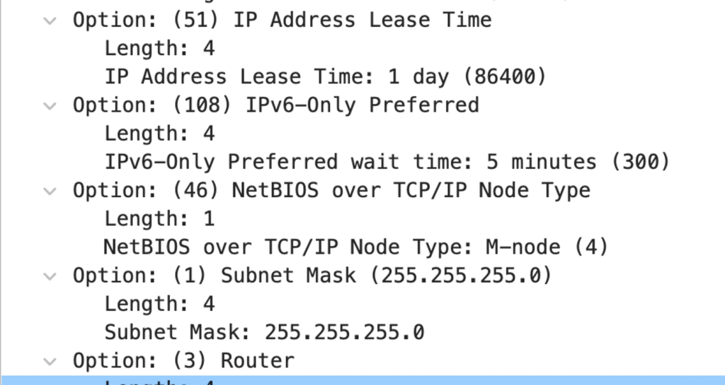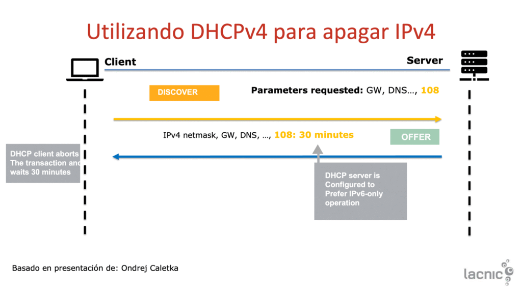 O servidor reconhece a opção 108 e é aqui que ocorre um “curto-circuito” no processo DORA do DHCPv4. O cliente não faz a solicitação (Request) de um endereço IPv4 e, naturalmente, o servidor nunca envia a confirmação (Acknowledge) desse endereço IPv4. Voila, um endereço IPv4 a mais disponível no pool do servidor DHCP.