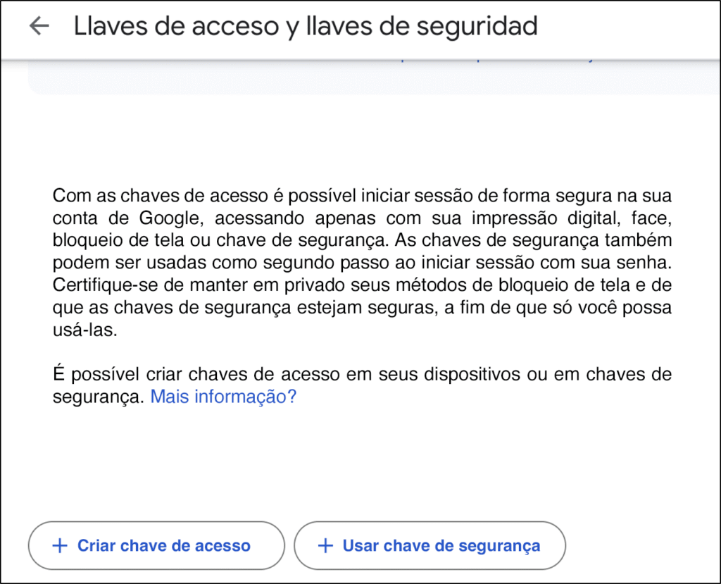 Pode aparecer como “Passkey” ou “Chave de acesso”, dependendo da tradução.