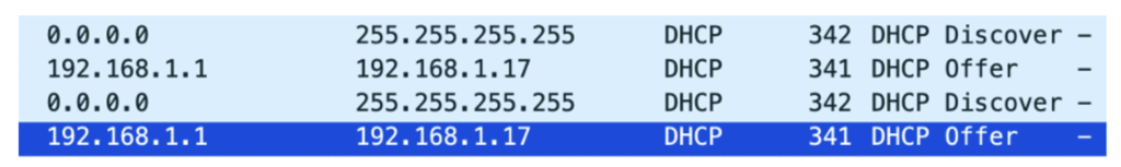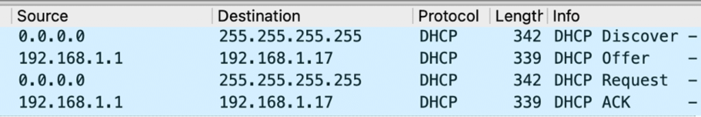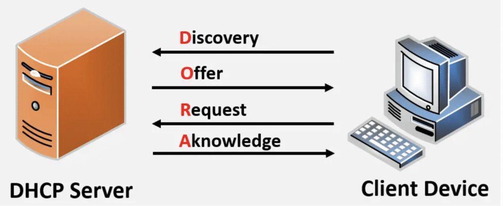 El proceso sigue 4 pasos principales, conocidos como DORA (Discover, Offer, Request, Acknowledgment). Muy breve cada paso:
