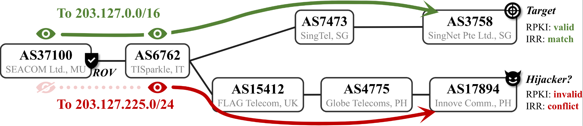 La sutileza de este caso es la intervención del ROV. En la Figura 1, solo el AS37100 aplica filtrado basado en ROV. Dado que el AS37100 descartó la ruta no válida del /24, solo mantuvo la ruta válida del /16 completo en su tabla de enrutamiento. Como resultado, el AS37100 y sus clientes no tenían visibilidad de la ruta inválida en el plano de control. En otras palabras, el AS37100 y sus clientes no tenían motivos para sospechar que algo andaba mal. Sin embargo, su tráfico hacia el /24 se desviaba a AS17894 a través del AS6762 legado, que no realizaba ROV y aceptaba la ruta /24 no válida. A menos que se les notificara o que por alguna razón investigaran activamente el /24, seguirían sin saber del secuestro en curso.