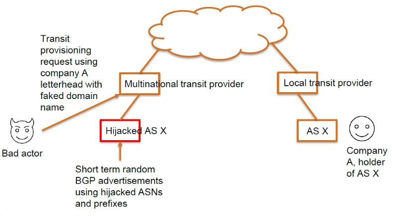 La Figura 1 muestra al titular legítimo del ASN, al ASN secuestrado y al atacante utilizando documentos de identidad falsificados para solicitar tránsito a un proveedor multinacional. El proveedor habilita BGP y el atacante emite anuncios cortos y aleatorios utilizando el ASN secuestrado.
