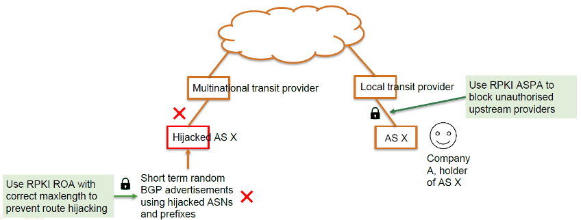 La Figura 2 destaca dos defensas clave: establecer valores precisos de MaxLength para las ROA y utilizar ASPA para prevenir proveedores upstream no autorizados.