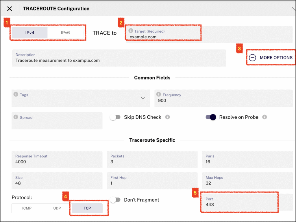 Con esta opción, las sondas ejecutarán la tradicional prueba de traceroute, que consiste en enviar una secuencia de paquetes ICMP, UDP o TCP con valores crecientes del campo TTL (Time To Live) hasta alcanzar el destino. Para nuestra medición, nos interesa seleccionar el protocolo TCP y utilizar el puerto 80 o 443, dependiendo de si el sitio malicioso utiliza HTTP o HTTPS, respectivamente. También debemos elegir entre IPv4 o IPv6, según corresponda. Es posible registrar varias mediciones dentro de una misma transmisión de telemetría; por ejemplo, podemos hacer dos clics en el botón Traceroute, seleccionando IPv4 en uno e IPv6 en el otro.